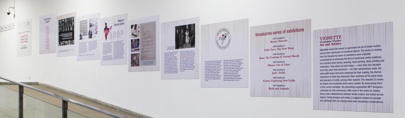 At the heart of NIFT's curriculum lies the art and craft of India. Visvakarma textiles, that were developed by the Weaver's Service Centres under the Ministry of Textiles, was an avant garde exploration of the traditional artistry of the country in the textiles section. Through weaving and handcrafts like block printing and dye painting, Visvakarma led to a dialogue between artists and weavers among different clusters. By choosing to present Vignette, a selection of Visvakarma textiles (borrowed from Weaver's Service Centre, New Delhi and NHHM, New Delhi) NIFT Bengaluru acknowledges the role of the government in preserving such skill set in the country, talks about public funding of textile art, and pays homage to the artists themselves- the weavers, the dyers, the painters et al.