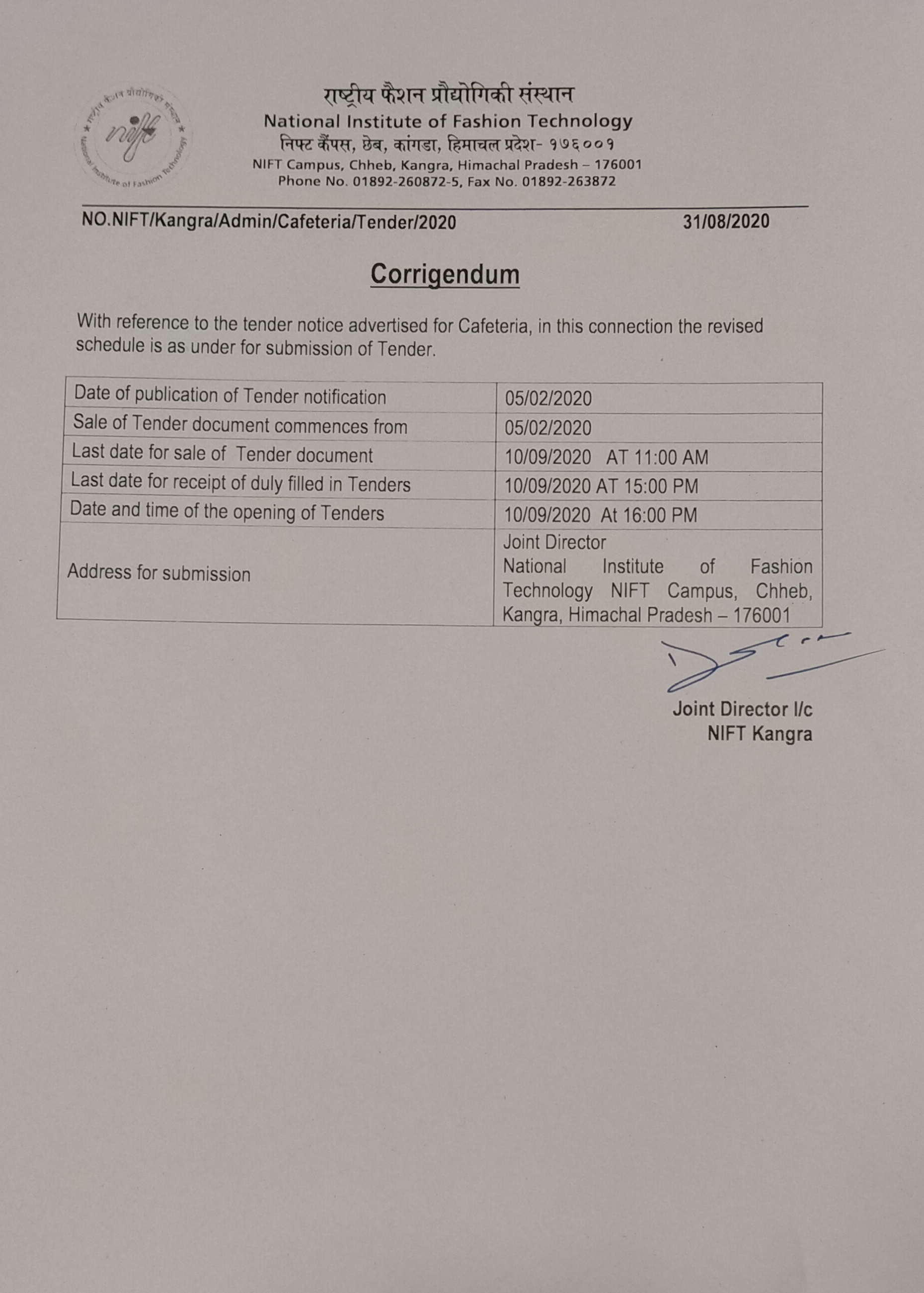 Corrigendum - Tender Document for Leasing of Cafeteria inside NIFT Kangra