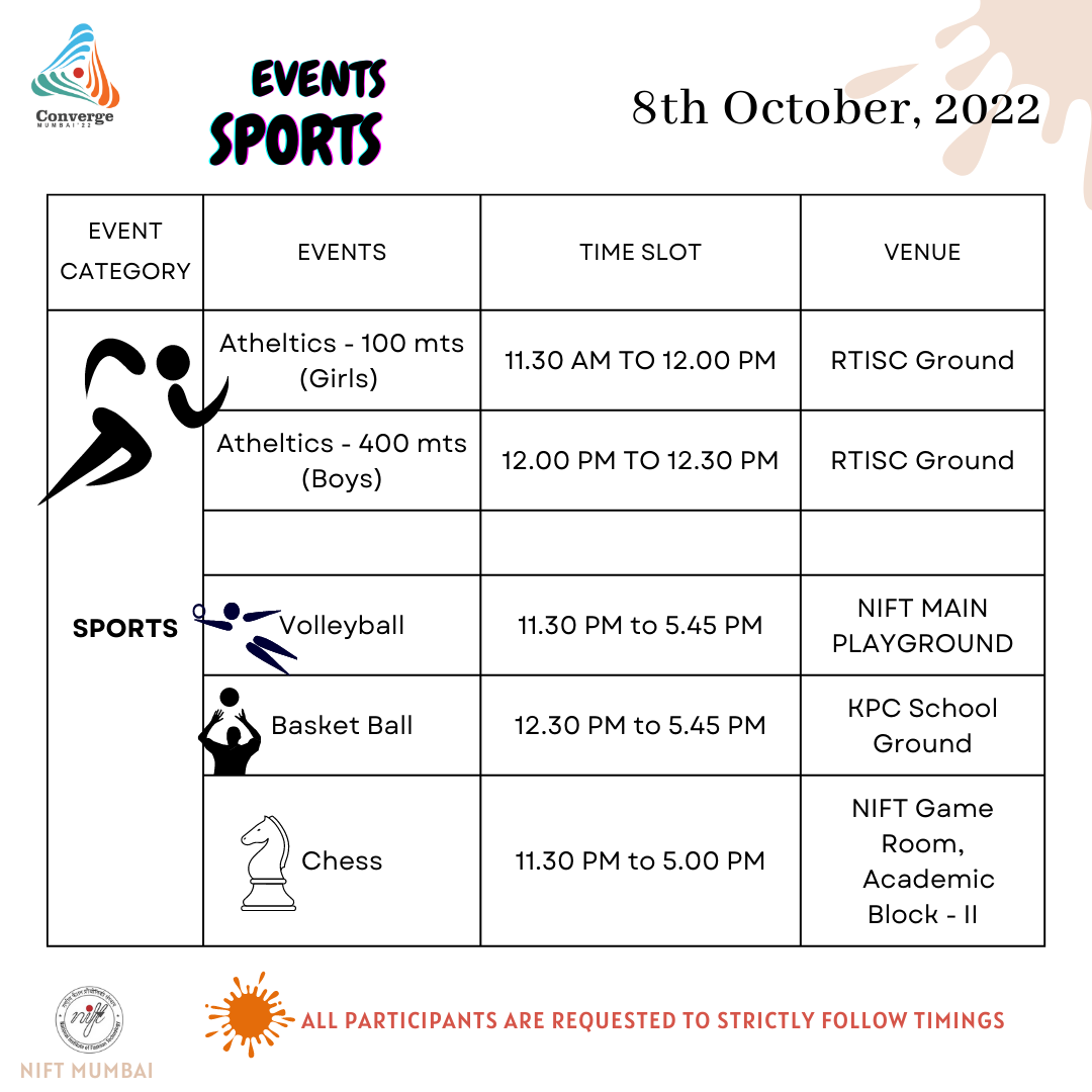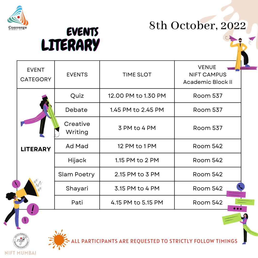 The Western Zone Converge 2022 from 08th to 09th October 2022 is being hosted by NIFT Mumbai, where the 4 campuses of NIFT Mumbai, NIFT Gandhinagar, NIFT Bhopal, and NIFT Jodhpur will be participating in Literary, Cultural, and Sports events. Converge, the inter-NIFT meet is organized each year to give the students a stage to exhibit their talents in the aforementioned fields and represent their respective campuses.